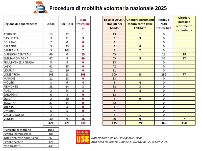 USB Pubblico Impiego – Agenzia delle Entrate rileva come la gestione attuale della mobilità nazionale continui a essere eccessivamente restrittiva, con effetti penalizzanti per centinaia di lavoratrici e lavoratori.