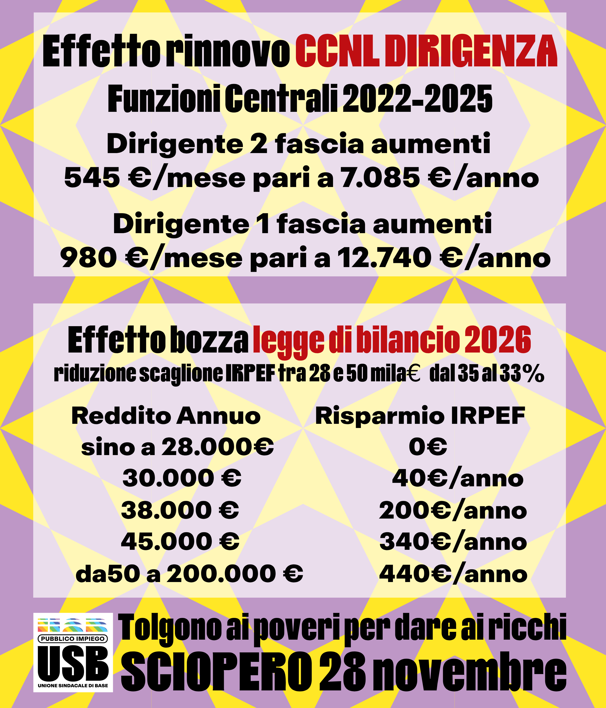 Tornare a un sistema fiscale davvero progressivo, abolire l’Iva sui beni di prima necessità e tassare gli extraprofitti delle banche (ben 112 miliardi nell’ultimo triennio) e i grandi patrimoni sono gli interventi che occorrono per ristabilire un carattere equo e redistributivo al nostro sistema fiscale: lo diremo con forza nelle piazze dello sciopero del 28 novembre! Lo ribadiremo il 29 novembre nella manifestazione nazionale a Roma.